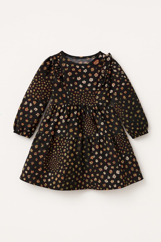 Siyah zeminli, turuncu ve beyaz çiçek desenli, uzun kollu, kat etekli, omuzları fırfır detaylı kız çocuk elbise.