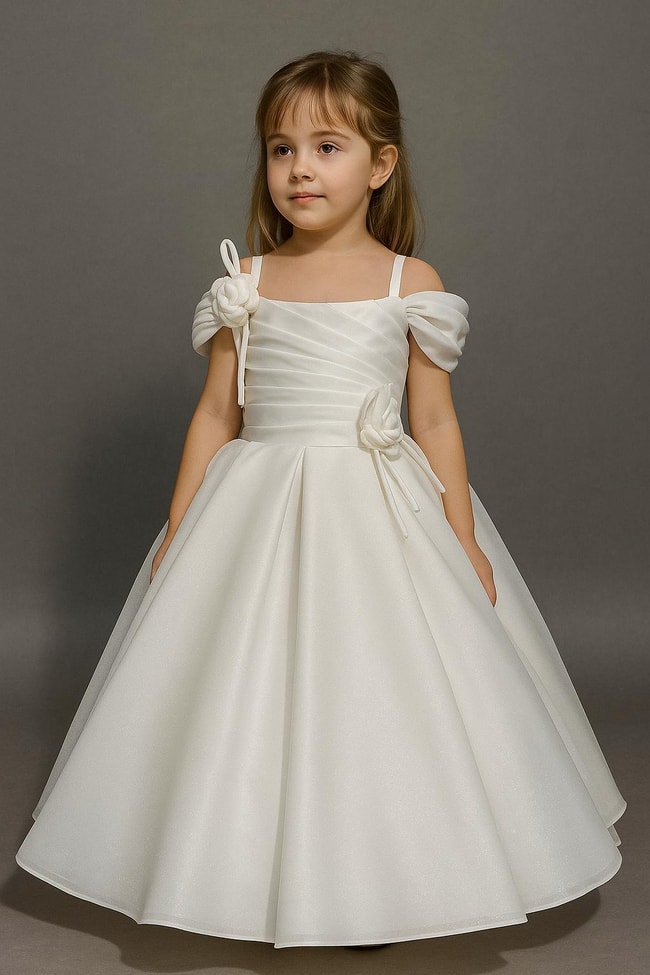 Kız Çocuk Tarlatanlı Beyaz Çiçek Aksesuarlı Abiye Elbise