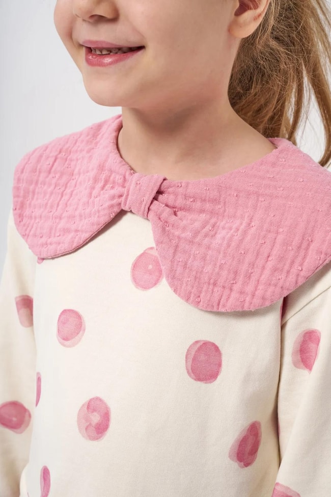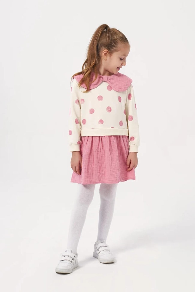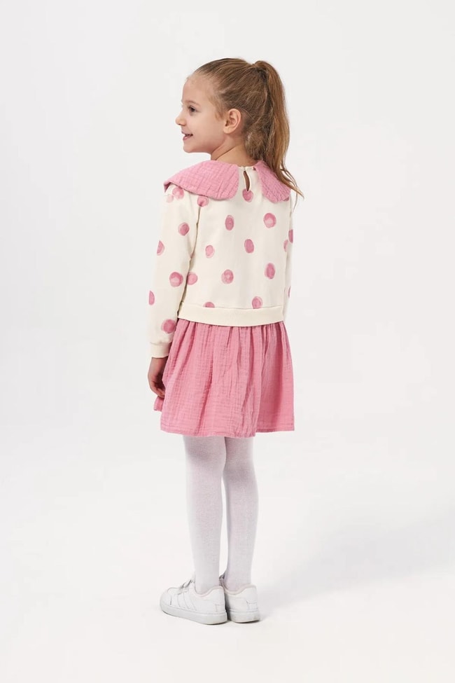 Magu Kız Çocuk 2-5 Yaş Puantiyeli Fiyonklu Elbise - Müslin Yaka Detaylı - Pembe