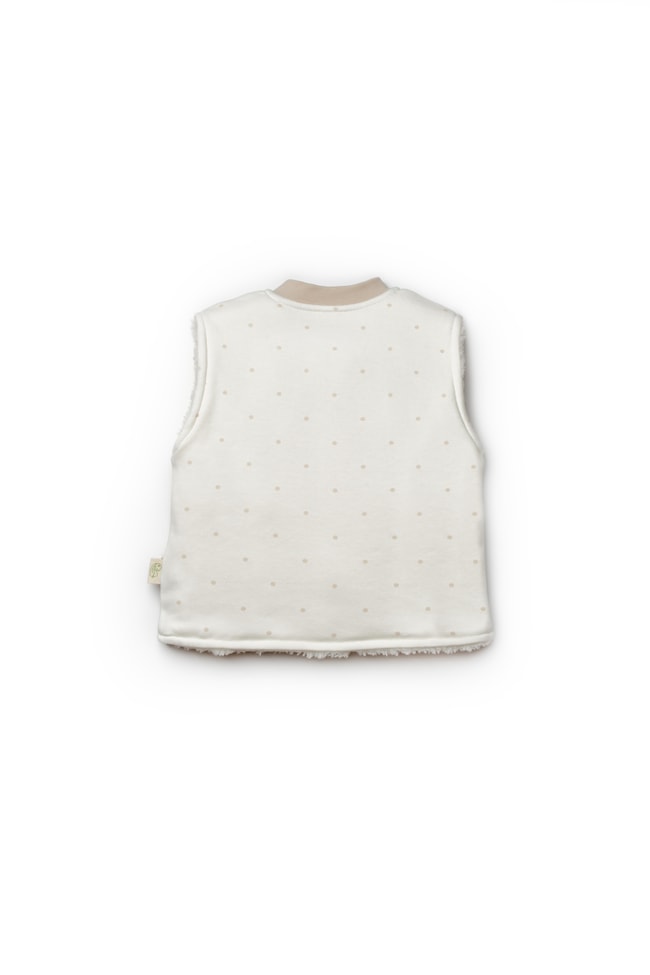 Organik pamuklu kumaş dış yüzey. İç kısmı yumuşak peluş astarlı, çıtçıt kapamalı kolsuz bebek yeleği. Gözlüklü ayıcık nakış detaylı.