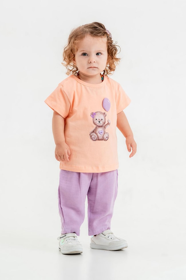 Magu %100 Pamuk Sevimli Ayıcık Baskılı Turuncu Kız Bebek Tişört ve Lila Pantolon İkili Takım, 6-18 ay arası minik prenseslerin stilini ve rahatlığını bir arada sunar! %100 pamuklu kumaşı sayesinde yumuşacık dokusu ve cilt dostu yapısıyla bebeklerin hassas cildine nazikçe dokunur.