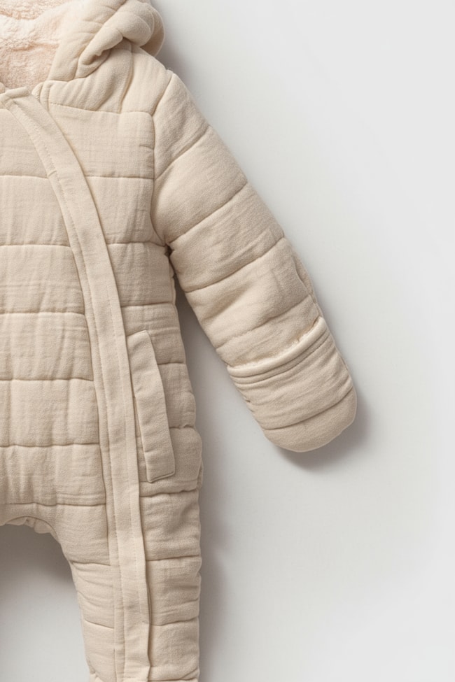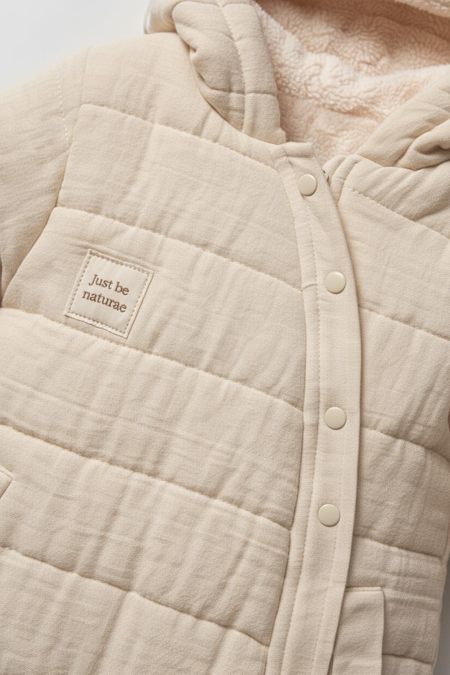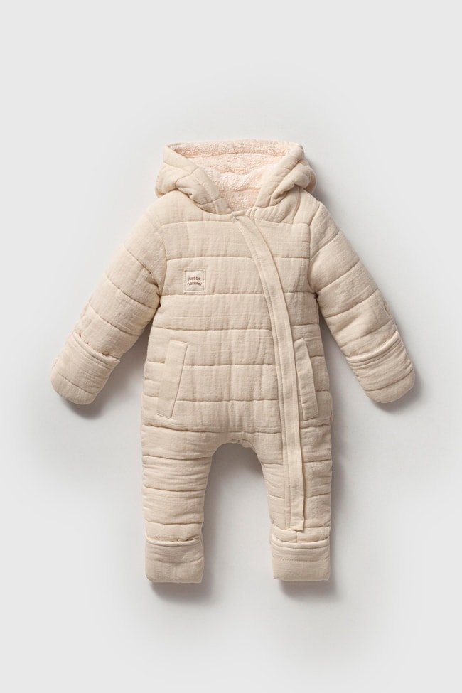 Organik pamuklu, kapüşonlu, kapitone desenli unisex bebek tulumu. Ekru renk, sıcak tutan kışlık tasarım.