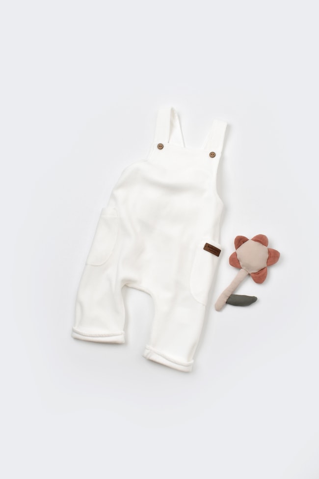 Unisex bebek pamuklu ekru kadife salopet tulum, minimal tasarımı ve konforlu yapısıyla öne çıkıyor. Kadife dokulu %100 pamuk kumaşı sayesinde bebeğinizin hassas cildine nazik bir temas sağlar. Ayarlanabilir askı düğmeleri kolay kullanım sunarken, yan cepler tuluma şık bir detay katar. Katlanabilir paçaları sayesinde uzun süreli kullanım imkânı sunar.