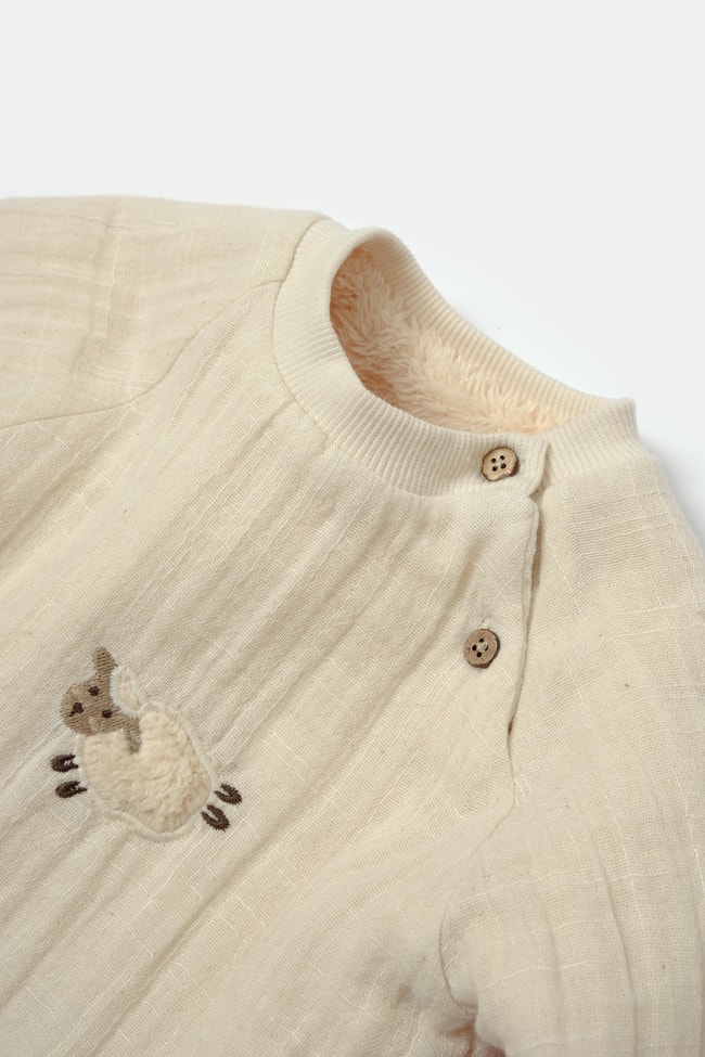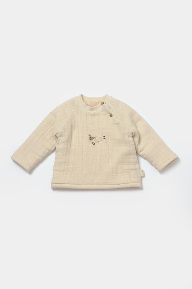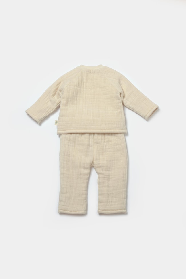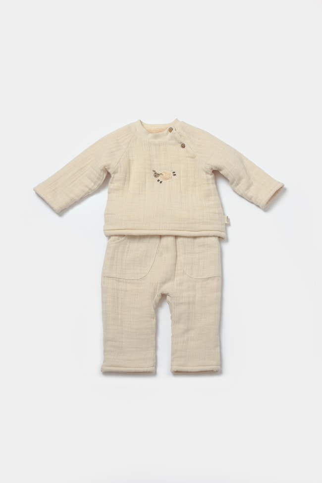 Doğal ekru tonuyla zarif ve sade bir görünüm sunan bu unisex bebek takımı, %100 pamuklu müslin kumaştan üretilmiştir. İç kısmındaki pelüş astarı sayesinde kış aylarında sıcaklık sağlar. Üst parçası kuzu nakış detaylı, bisiklet yaka ve omuzdan düğmeli tasarımı ile pratik kullanım sunar. Pantolon parçası ise elastik beli ve geniş cepleriyle rahatlık ve kullanım kolaylığı sağlar. Yumuşak dokusu sayesinde bebeklerin narin cildine uygundur. Günlük giyimde konforlu bir seçenek olarak ya da kış aylarına özel şık bir hediye alternatifi olarak tercih edilebilir.