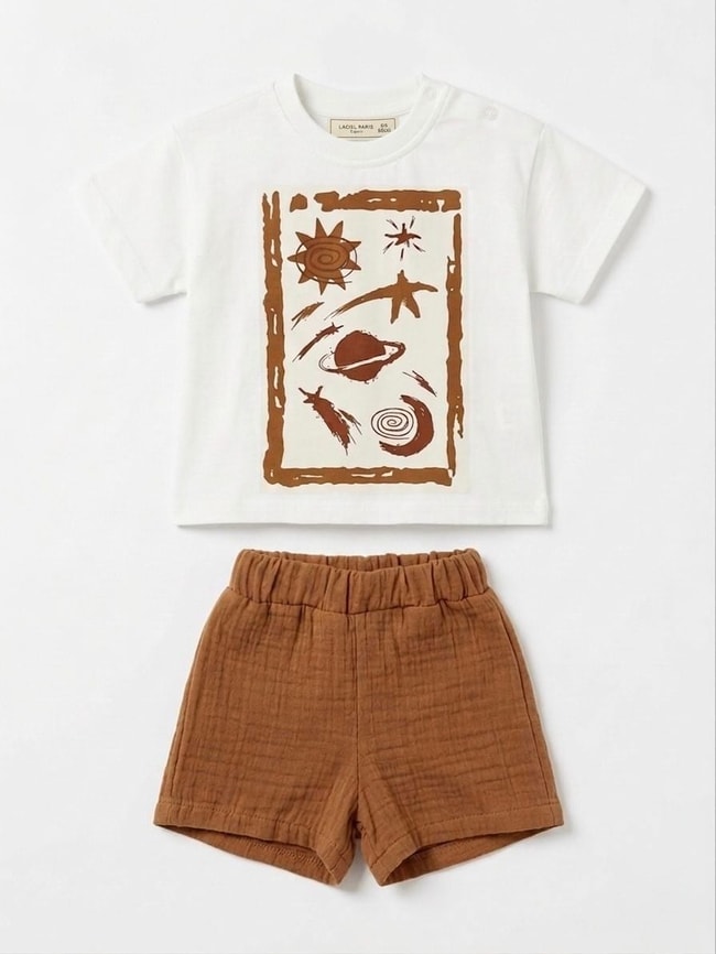 İki parçalı takım. Bisiklet yaka, kısa kollu, omuzdan çıtçıtlı, ön yüzü uzay temalı baskılı pamuklu t-shirt. Elastik belli, tarçın rengi pamuklu şort.