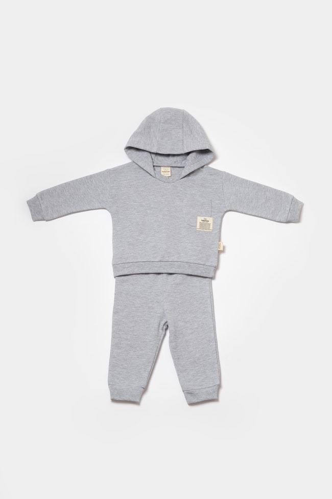 Unisex bebek pamuklu gri kapüşonlu eşofman takımı, miniklerin gün boyu rahat etmesi için tasarlanmıştır. Yumuşak ve nefes alabilen pamuklu kumaşı sayesinde bebeğinizin cildini tahriş etmez, maksimum konfor sağlar. Üst kısmında kapüşon ve ön cep detayı bulunan sweatshirt, soğuk havalarda ekstra koruma sunarken modern bir görünüm kazandırır. Alt kısmı ise elastik beli ve ribana paçalarıyla bebeğinizin hareket özgürlüğünü destekler. Günlük kullanım, park gezileri veya ev içi rahatlık için ideal olan bu takım, hem kız hem erkek bebekler için uygundur. Şık tasarımıyla hediye alternatifi olarak da tercih edebilirsiniz.