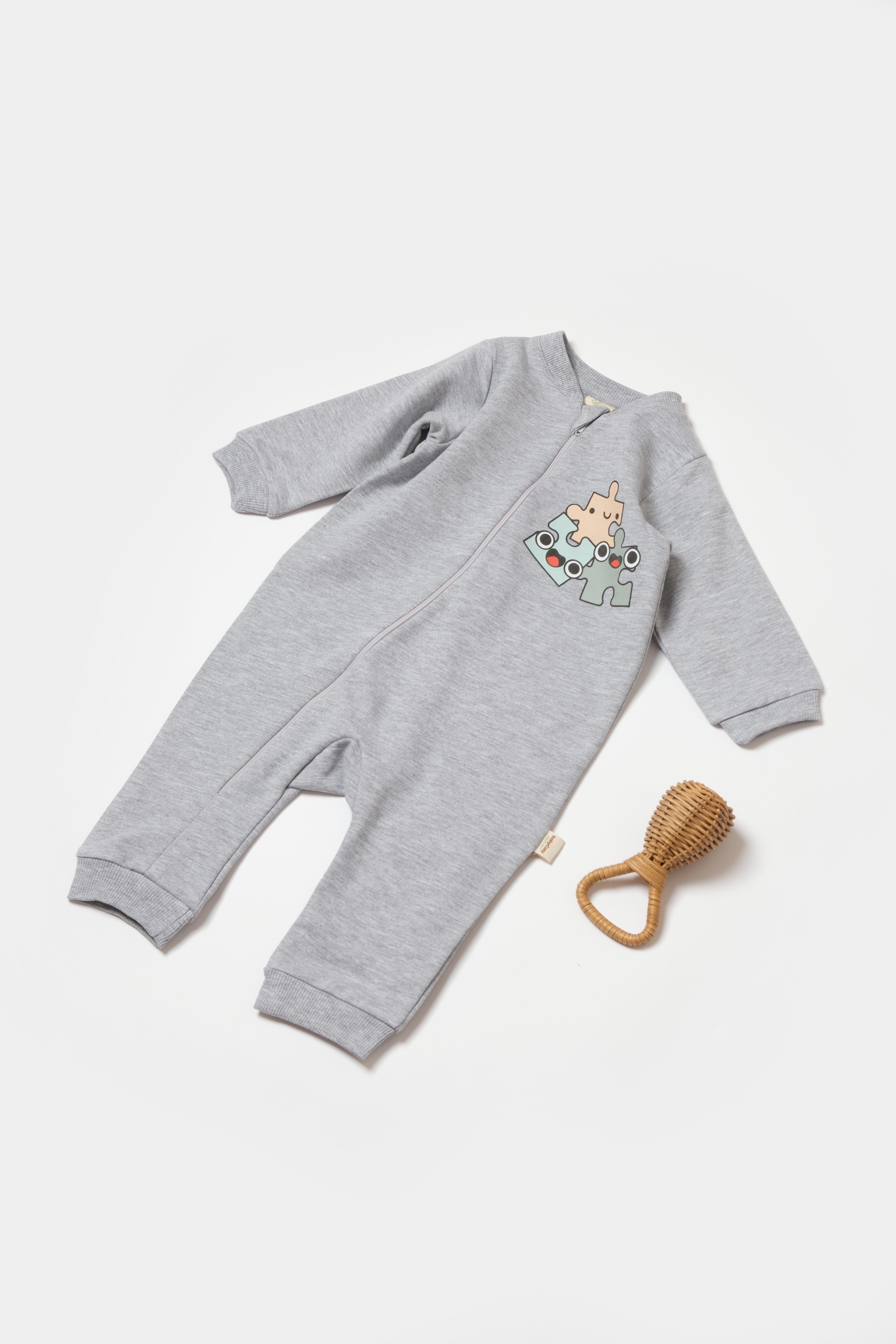 Unisex bebekler için tasarlanan gri pamuklu tulum, eğlenceli puzzle baskısı ile dikkat çeker. Ön kısmındaki fermuar detayı sayesinde kolayca giydirilip çıkarılabilir. Yumuşak ve nefes alabilen pamuklu kumaşı bebeğinizin hassas cildine dosttur. Ribana bilek ve paça detayları tulumun formunu korurken, rahat hareket etmeye olanak sağlar. Günlük kullanım için hem şık hem de fonksiyonel olan bu tulum, bebeğinizin gardırobunun sevimli ve kullanışlı parçalarından biri olacaktır.