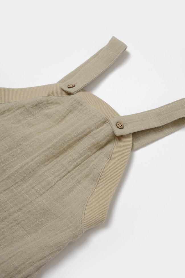 İki parçalı pamuklu takım. Düğmeli askılı haki müslin tulum ve uzun kollu desenli iç body.