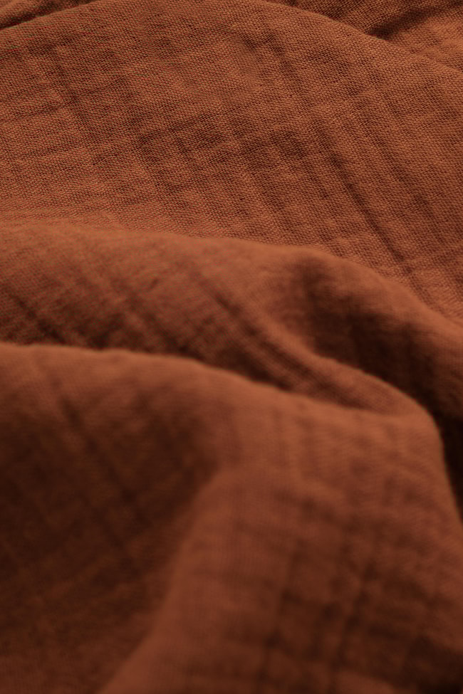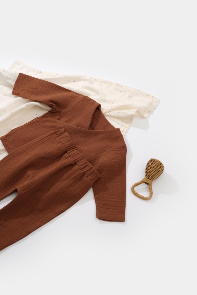 İki parçalı müslin takım. Kruvaze yaka, uzun kollu üst. Esnek bel detaylı, rahat kesim pantolon. %100 pamuk, nefes alabilen doğal kumaş.