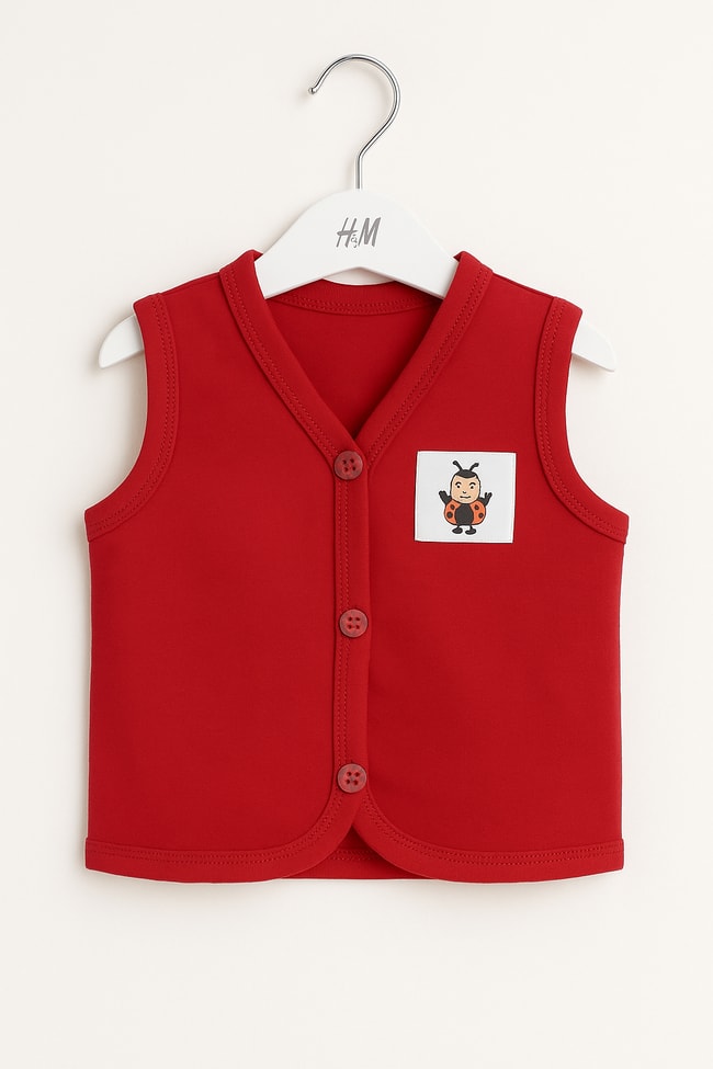 Yumuşak pamuklu kumaştan üretilmiş, uğur böceği figürlü, düğme detaylı unisex bebek yeleği.