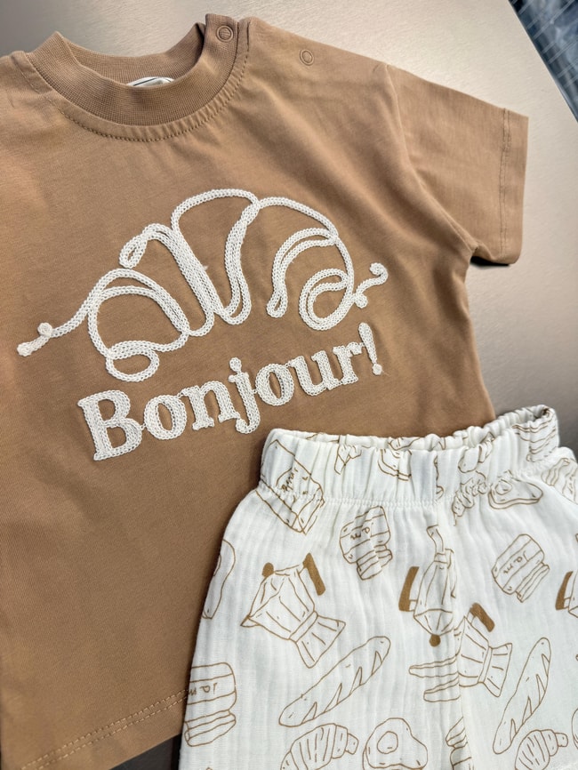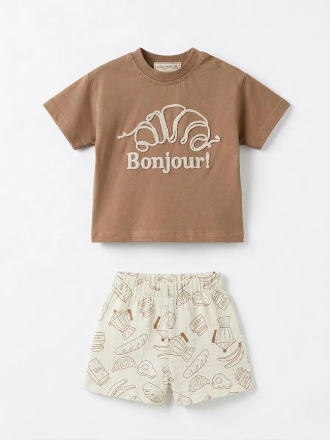 İki parçalı takım. Bisiklet yaka, kısa kollu, omuzdan çıtçıtlı, ön yüzü kruvasan figürlü ve yazı detaylı pamuklu t-shirt. Elastik belli, ekmek ve kruvasan desenli pamuklu şort.