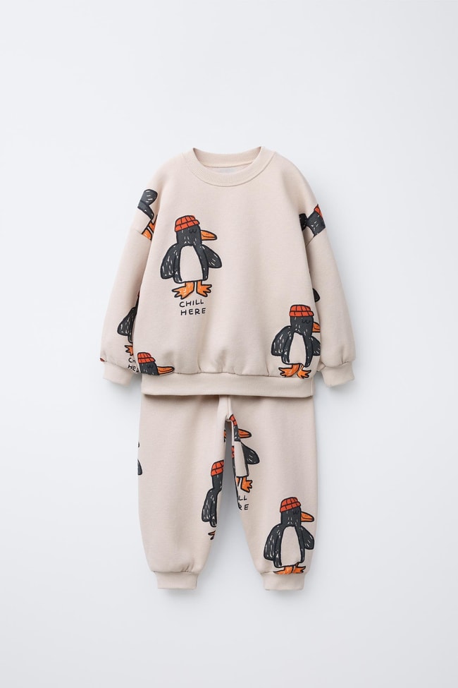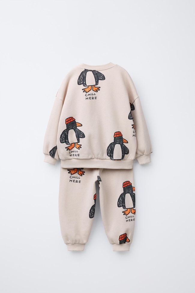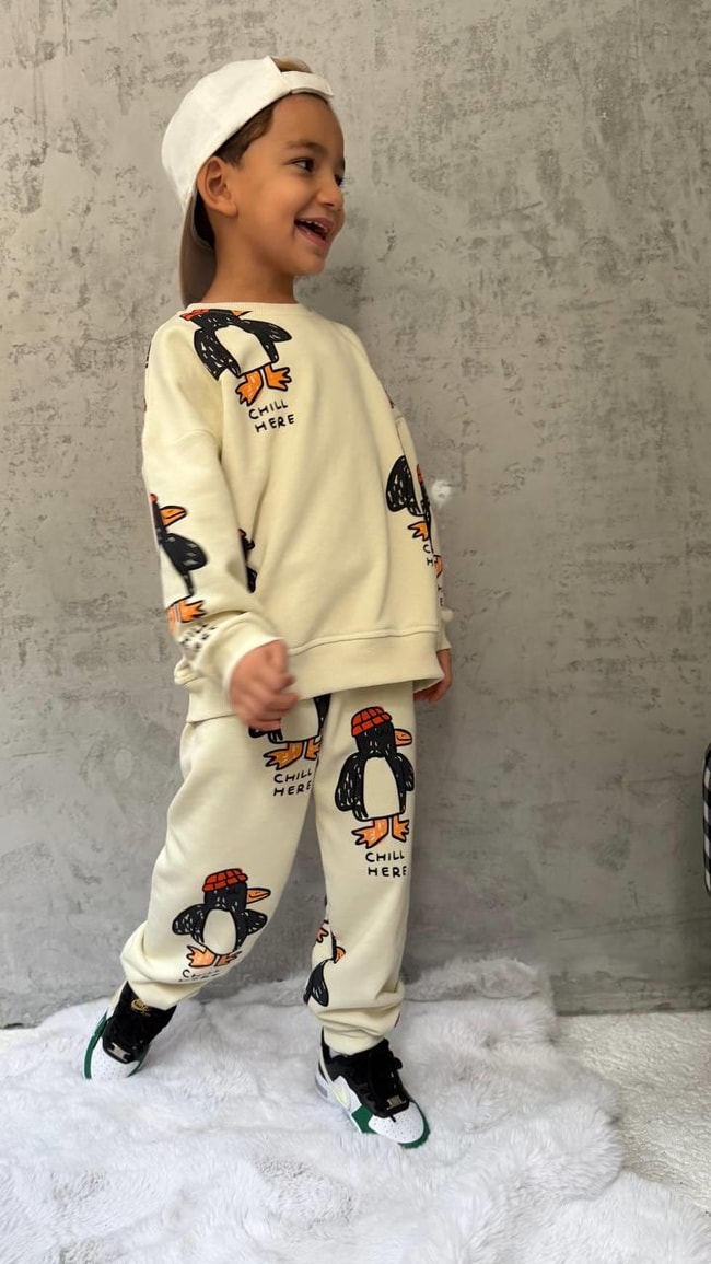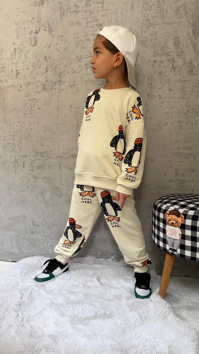 İki parçalı pamuklu eşofman takımı. Bisiklet yaka, uzun kollu, ribana manşetli penguen desenli sweatshirt. Esnek bel lastikli, aynı desenli eşofman altı ile tamamlanmıştır.