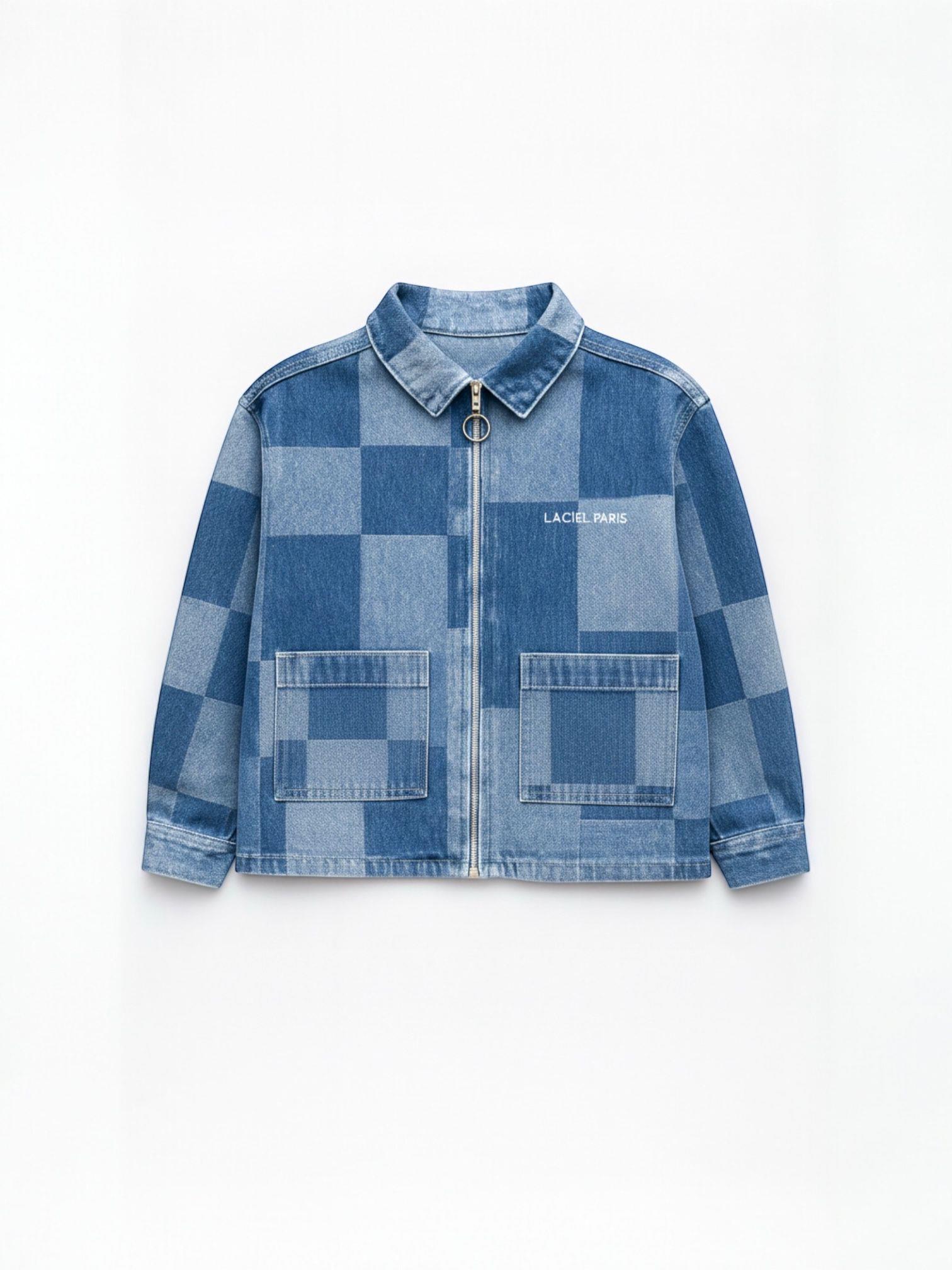 Pamuklu kumaştan üretilmiş, kare desenli denim ceket. Metal halka detaylı fermuarı ve büyük ön cepleriyle rahat ve modern bir stil sunar.