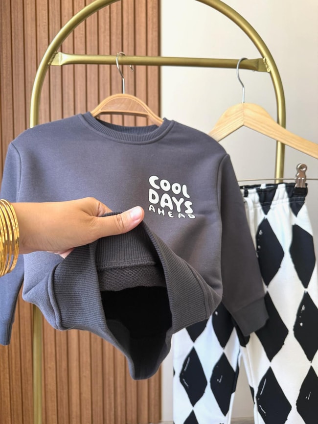 Unisex çocuklar için tasarlanmış bu pamuklu takım, modern ve rahat tarzı ile öne çıkıyor. Siyah renkli, "Cool Days Ahead" yazı baskılı sweatshirt sade ama şık bir görünüm sunarken yumuşak kumaşıyla konfor sağlar. Kısa kollu görünüme sahip rahat kesimi, günlük kullanımda hareket özgürlüğü verir. Siyah-beyaz geometrik desenli bermuda ise elastik beli sayesinde kolay giyilip çıkarılabilir ve esnek yapısıyla gün boyu rahatlık sağlar. Hem evde hem de dışarıda kullanılabilecek bu takım, sportif ve trend tasarımıyla miniklerin dolabında vazgeçilmez olacak. Ayrıca hediye alternatifi olarak da değerlendirilebilir.